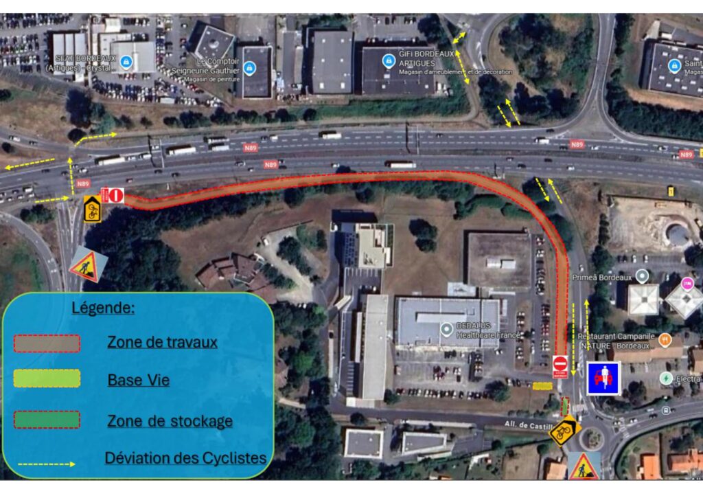 - des déviations seront mises en place par l’avenue de l’Église Romane pour reprendre la piste cyclable le long de la RN89 (voir plan ci-dessous)